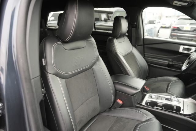 This 2022 Ford Explorer ST in Stone Blue Metallic comes with the following features: 3.0L EcoBoost V6 10-Speed Automatic 4WD Equipment Group 400A, Ford Co-Pilot360 Assist+ (Evasive Steering Assist, Intelligent Adaptive Cruise Control, Speed Sign Recognition, and Voice-Activated Touchscreen Navigation System), Explorer ST, 4D Sport Utility, 3.0L EcoBoost V6, 10-Speed Automatic, 4WD, Stone Blue Metallic, Ebony Leather, Panic alarm, 1st Row Heated Seats, 20 Machined Aluminum w/Painted Pockets Wheels, 3.58 Non-Limited-Slip Rear Axle Ratio, 3rd row seats: bench, 4-Wheel Disc Brakes, 6 Speakers, ABS brakes, Air Conditioning, Alloy wheels, AM/FM radio: SiriusXM, AM/FM Stereo, Auto High-beam Headlights, Automatic temperature control, Brake assist, Bumpers: body-color, Compass, Delay-off headlights, Driver door bin, Driver vanity mirror, Dual front impact airbags, Dual front side impact airbags, Electronic Stability Control, Emergency communication system: SYNC 3 911 Assist, Exterior Parking Camera Rear, FordPass Connect, Four wheel independent suspension, Front anti-roll bar, Front Bucket Seats, Front Center Armrest, Front dual zone A/C, Front fog lights, Front reading lights, Fully automatic headlights, Heated door mirrors, Heated front seats, Heated steering wheel, Illuminated entry, Knee airbag, Leather steering wheel, Low tire pressure warning, Memory seat, Occupant sensing airbag, Outside temperature display, Overhead airbag, Overhead console, Passenger door bin, Passenger vanity mirror, Power door mirrors, Power driver seat, Power Liftgate, Power passenger seat, Power steering, Power windows, Rear air conditioning, Rear anti-roll bar, Rear reading lights, Rear window defroster, Rear window wiper, Remote keyless entry, Security system, SelectShift Capability w/Paddle Shifters, Speed control, Speed-sensing steering, Speed-Sensitive Wipers, Split folding rear seat, Spoiler, Sport steering wheel, Steering wheel mounted audio controls, SYNC 3 Communications & Entertainment System, SYNC 3/Apple CarPlay/Android Auto, Tachometer, Telescoping steering wheel, Tilt steering wheel, Traction control, Trip computer, Variably intermittent wipers, and Ventilated front seats.