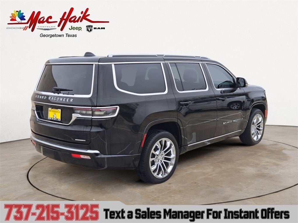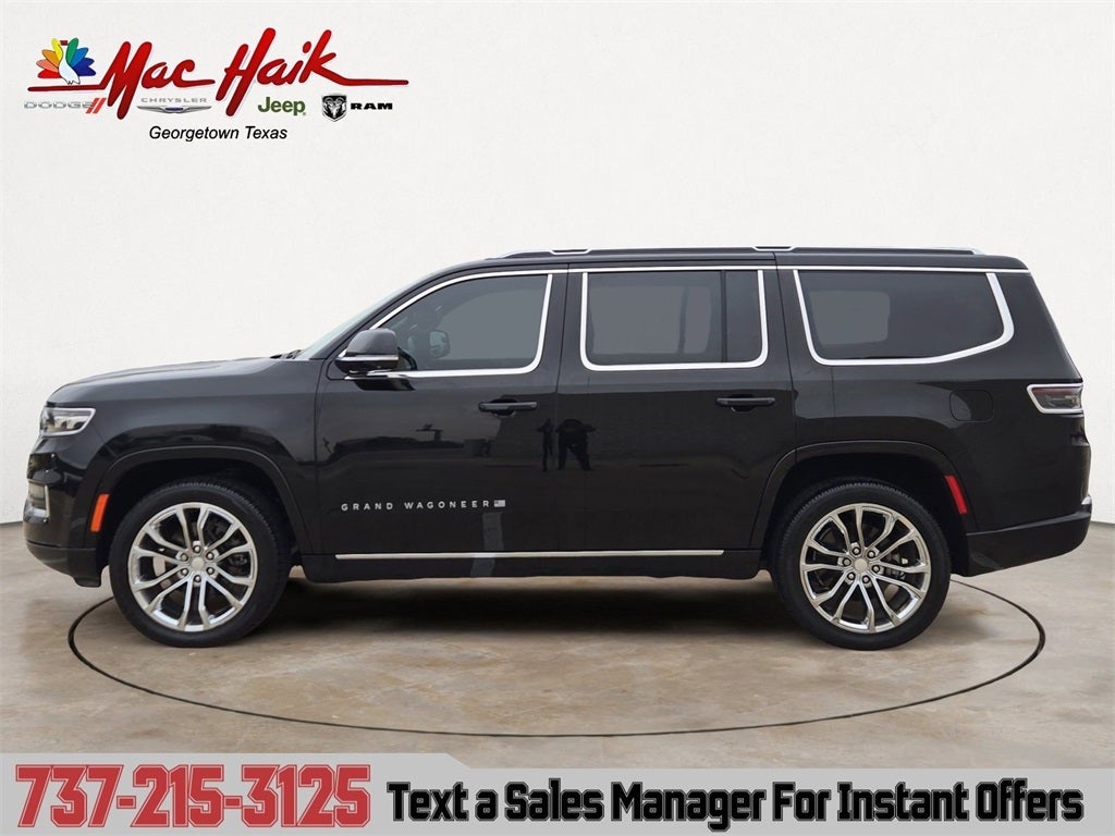 This 2022 Jeep Grand Wagoneer Series II in Diamond Black Crystal Pearlcoat includes the following features: 6.4L V8 8-Speed Automatic 4WD Quick Order Package 23S, Two Tone Paint Group, Mac Haik Certified, 19 Speakers, 3.92 Rear Axle Ratio, 3rd row seats: bench, 4-Wheel Disc Brakes, ABS brakes, Adjustable pedals, Air Conditioning, Alloy wheels, AM/FM radio: SiriusXM with 360L, Anti-whiplash front head restraints, Audio memory, Auto High-beam Headlights, Auto-dimming door mirrors, Auto-dimming Rear-View mirror, Auto-leveling suspension, Automatic temperature control, Body Color Roof, Brake assist, Bumpers: body-color, Compass, Delay-off headlights, Driver door bin, Driver vanity mirror, Driver's Seat Mounted Armrest, Dual front impact airbags, Dual front side impact airbags, Electronic Stability Control, Four wheel independent suspension, Front anti-roll bar, Front Bucket Seats, Front Center Armrest w/Storage, Front dual zone A/C, Front fog lights, Front Passenger Interactive Display, Front reading lights, Fully automatic headlights, Garage door transmitter, Genuine wood console insert, Genuine wood dashboard insert, Genuine wood door panel insert, Heads-Up Display, Heated door mirrors, Heated front seats, Heated rear seats, Heated steering wheel, Illuminated entry, Knee airbag, Leather steering wheel, Leather Trimmed Bucket Seats, Low tire pressure warning, Memory seat, Navigation System, Normal Duty Suspension, Occupant sensing airbag, Outside temperature display, Overhead airbag, Overhead console, Panic alarm, Passenger door bin, Passenger seat mounted armrest, Passenger vanity mirror, Pedal memory, Power adjustable front head restraints, Power door mirrors, Power driver seat, Power Liftgate, Power moonroof, Power passenger seat, Power steering, Power windows, Radio data system, Radio: Uconnect 5 Nav w/12.0 Display, Rain sensing wipers, Rear air conditioning, Rear anti-roll bar, Rear dual zone A/C, Rear reading lights, Rear seat center armrest, Rear window defroster, Rear window wiper, Reclining 3rd row seat, Remote keyless entry, Security system, Speed control, Speed-sensing steering, Speed-Sensitive Wipers, Split folding rear seat, Steering wheel memory, Steering wheel mounted audio controls, Tachometer, Telescoping steering wheel, Tilt steering wheel, Traction control, Trip computer, Turn signal indicator mirrors, Variably intermittent wipers, Ventilated front seats, Voltmeter, Wheels: 22 x 9.0 Premium 1 Aluminum, and Wheels: 22 x 9.0 Premium 2 Aluminum. Recent Arrival!