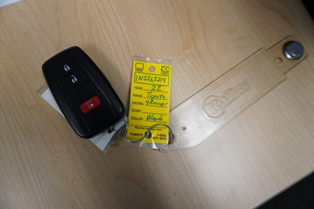 This 2022 Toyota 4Runner TRD Sport in Black includes the following features: 4.0L V6 DOHC 24V 5-Speed with ECT RWD Black/Graphite Artificial Leather, 3.727 Axle Ratio, 4-Wheel Disc Brakes, 8 Speakers, ABS brakes, Air Conditioning, Alloy wheels, AM/FM radio: SiriusXM, Anti-whiplash front head restraints, Apple CarPlay/Android Auto, Auto High-beam Headlights, Black Roof Rails, Brake assist, Bumpers: body-color, Driver door bin, Driver vanity mirror, Dual front impact airbags, Dual front side impact airbags, Electronic Stability Control, Emergency communication system: Safety Connect with 1-year trial, Exterior Parking Camera Rear, Front anti-roll bar, Front Bucket Seats, Front Center Armrest, Front fog lights, Front reading lights, Front wheel independent suspension, Heated door mirrors, Illuminated entry, Knee airbag, Leather Shift Knob, Leather steering wheel, Low tire pressure warning, Occupant sensing airbag, Outside temperature display, Overhead airbag, Overhead console, Panic alarm, Passenger door bin, Passenger vanity mirror, Power door mirrors, Power driver seat, Power steering, Power windows, Radio: Audio, Rear anti-roll bar, Rear seat center armrest, Rear window defroster, Rear window wiper, Remote keyless entry, Roof rack: rails only, Security system, Shift Knob, SofTex Seat Trim, Speed control, Speed-sensing steering, Split folding rear seat, Spoiler, Steering wheel mounted audio controls, Tachometer, Telescoping steering wheel, Tilt steering wheel, Traction control, TRD Sport Badge, TRD Sport Carpet Floor Mats, Trip computer, Variably intermittent wipers, and Wheels: 20 Dark Gray Metallic Machined-Face Alloy. Black 2022 Toyota 4Runner TRD Sport RWD 5-Speed with ECT 4.0L V6 DOHC 24V Black/Graphite Artificial Leather.